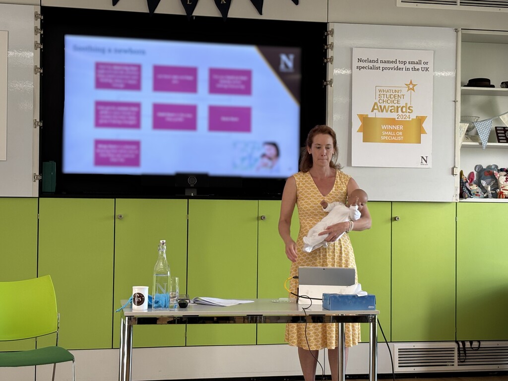 この新生児ケアワークショップは、ナニーとして活躍後、現在はノーランドカレッジにて後進の育成にあたられている先生が担当してくださいました。