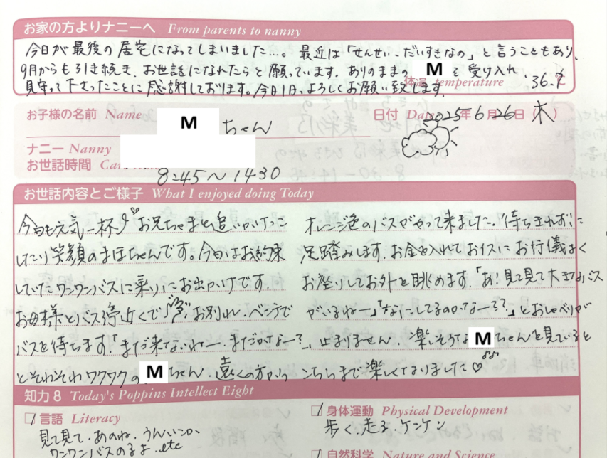 親が出勤する瞬間こそ寂しげな様子を見せるものの、玄関のドアが閉まると同時に娘の最高にオリジナルな1日が始まることが、ポピンズメモリーには綴られています。それは、娘の性格や個性を丁寧に読み取ってオーガナイズしてくださるナニーさんがいて下さるからこそ成立するのです。いつしか私にも、娘の良いところをキャッチするナニーさんの目線が伝染したようで、ポピンズメモリー後半は「おしゃべりが上手です!」「お片付けを手伝ってくれます!」と書くようになっていました。
