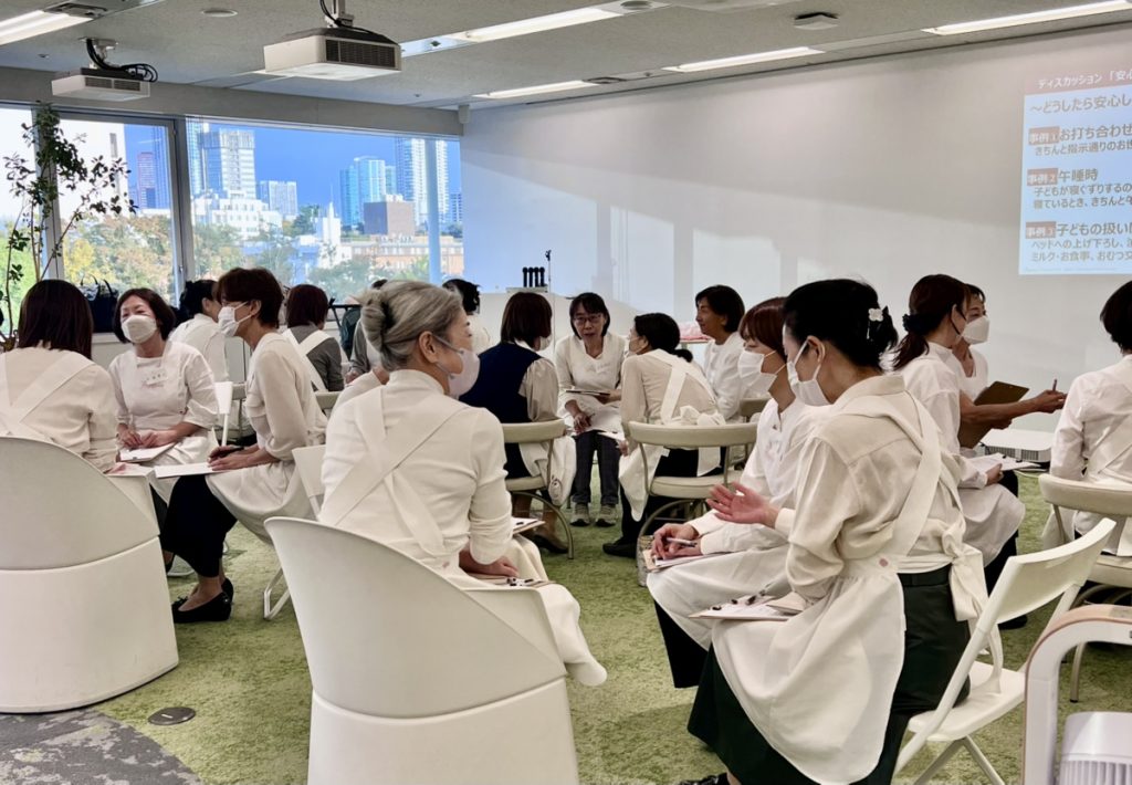 それぞれのグループで、保護者様に不安を感じさせないためにお伺いやお尋ねしたほうが良いことなど活発な意見交換が行われました。ナニーの皆さんのお仕事は、日ごろはおひとりで行うことが多いため、研修でほかのナニーさんの意見や考え方を聞けることも、刺激にもなりそうですね。