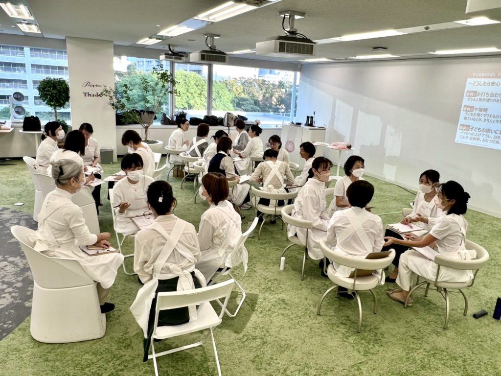 「更新時研修」は座学ばかりではありません。グループに分かれたディスカッションも行います。保護者様がご心配なさることや不安に思うことを想定しケーススタディとして、各グループで意見を出しあいます。例えば保護者様をこんなお気持ちにさせてしまわないために、皆さんならどのようにふるまい・行動しますか?