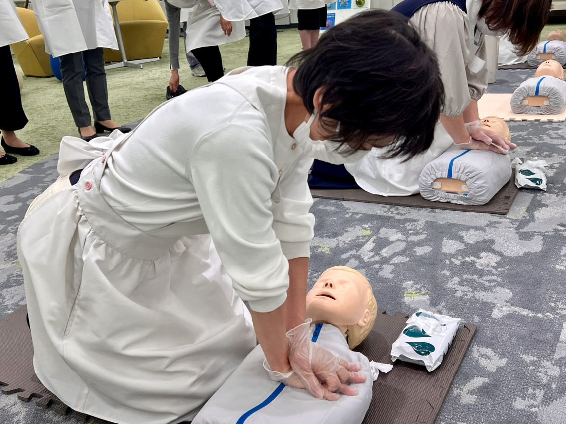 「更新時研修」にはもうひとつ大きな役割があります。それは「心肺蘇生法テスト」。「ナニー基礎実技研修」で習得した技能ですが、お子さまの命をお守りするお仕事である以上、いざというその時に必ずできるようにこの「更新時研修」で再度テストをします。全員必須かつ合格するまで繰り返し行います。